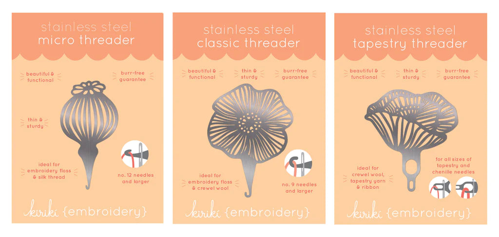 Thread your needles with ease with this stainless steel needle threader! Threaders sometimes get a bad rap because we've all broken those flimsy wire ones after a single use, but solid body threaders are regarded as the best, and these are not only functional but add a bit of beauty to your toolkit, too!  These threaders are extremely high quality, completely smooth, durable and made in Canada.